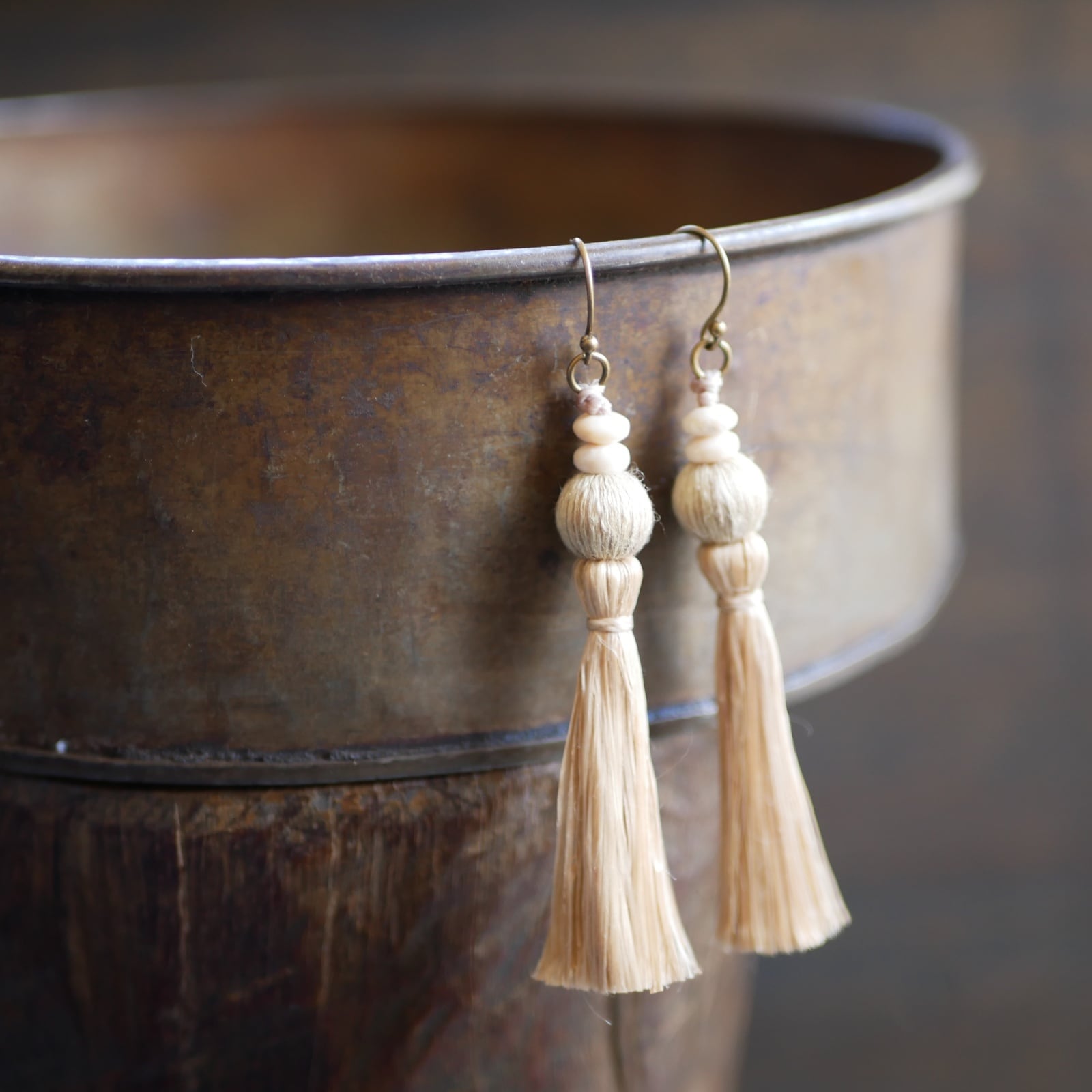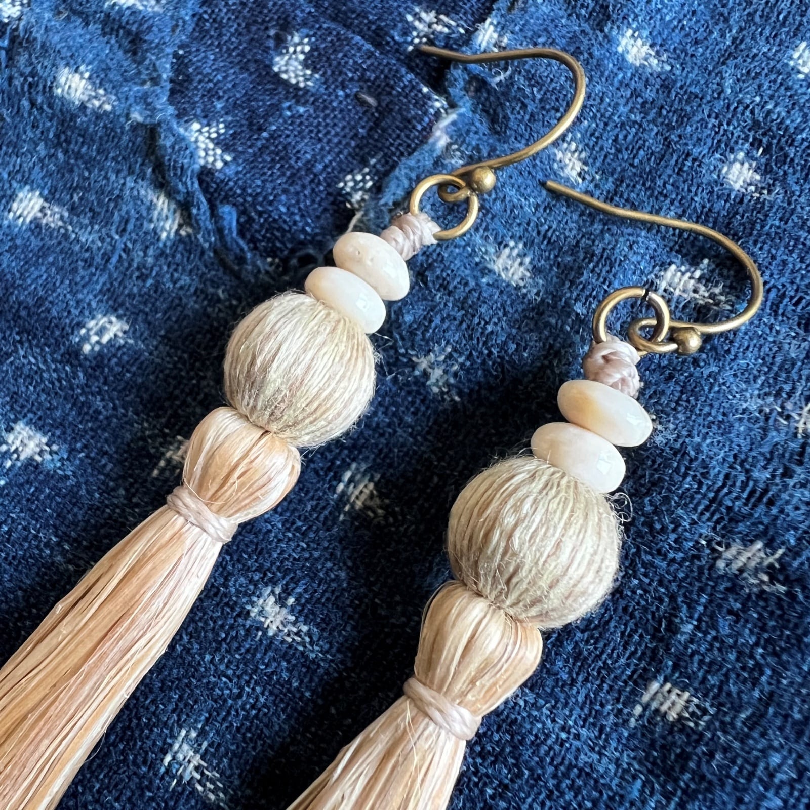 このピアスは、日本の古き良き素材、「精麻」と「結城紬玉」を用いた作品です。