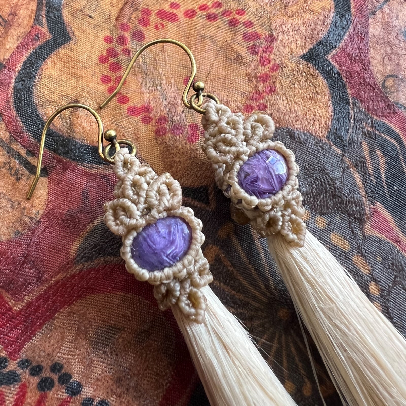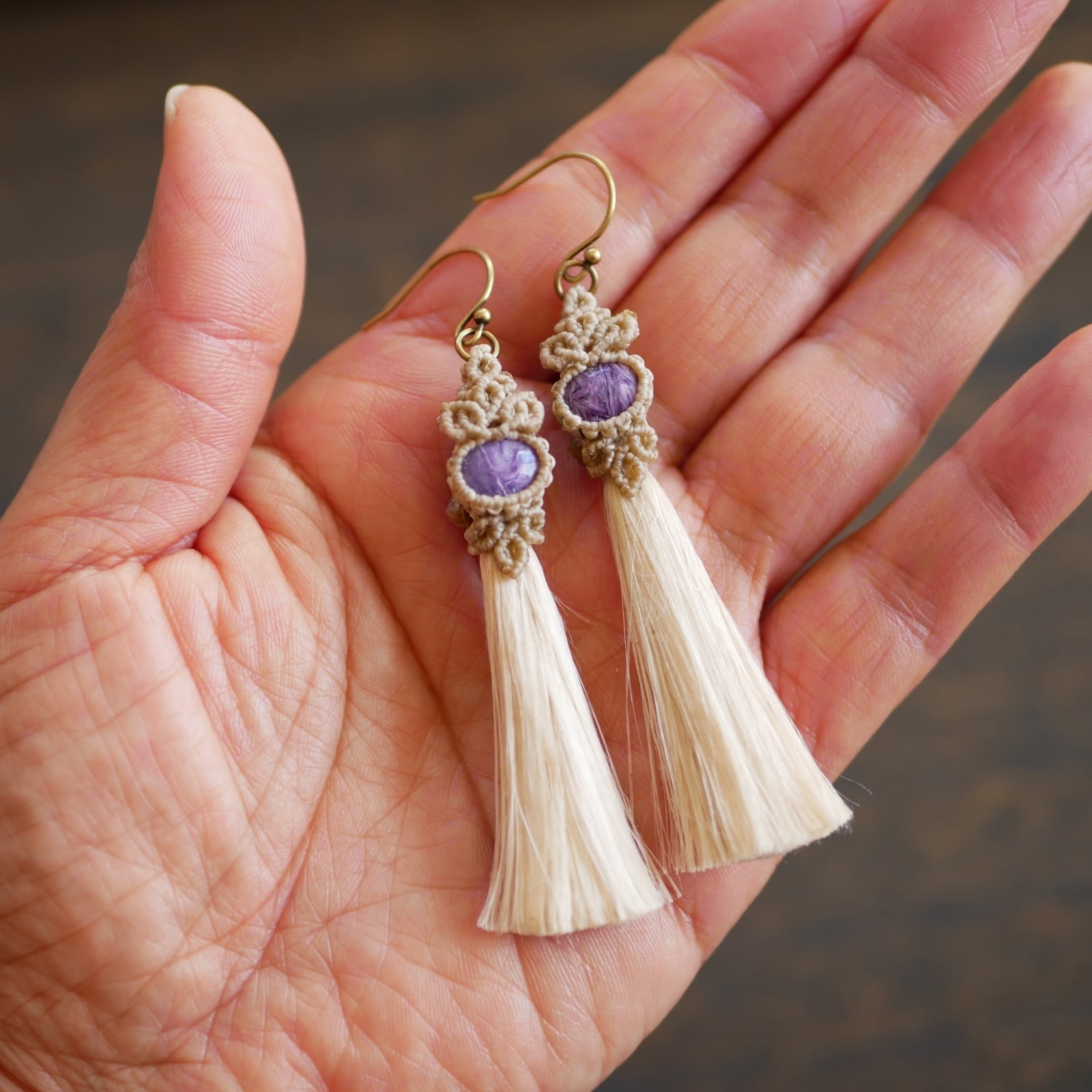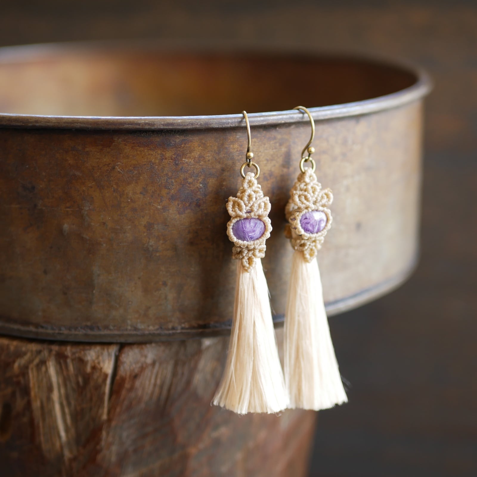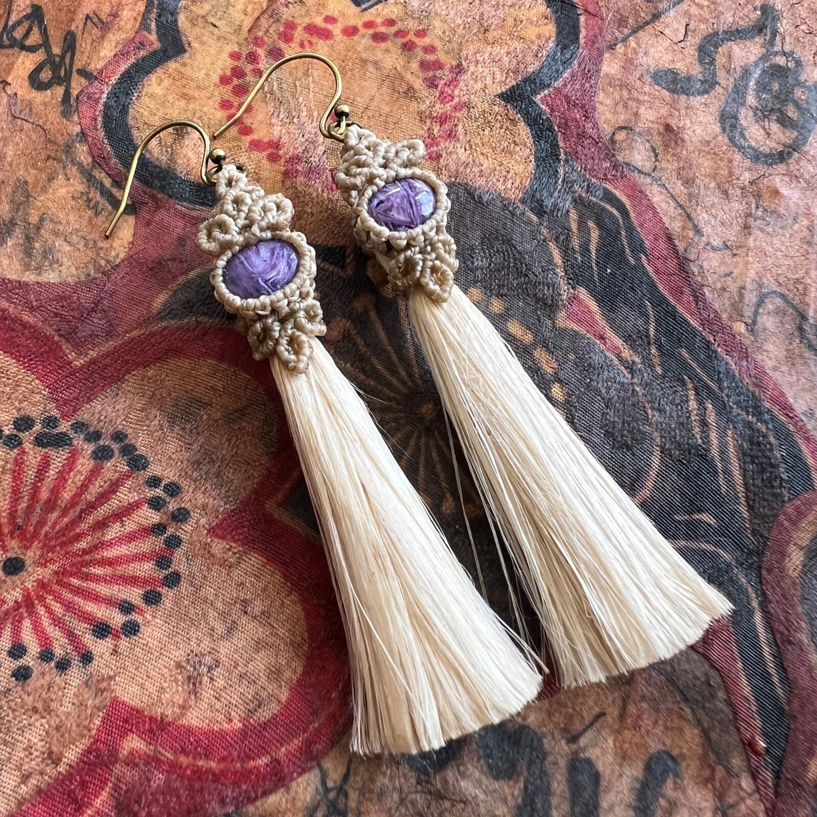 チャロアイトの神秘的な紫色と精麻の持つ独特の質感が、耳元を引き立てるシンプルながらも個性的なデザインとなっています✨