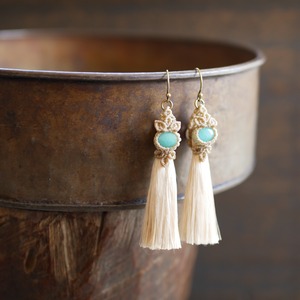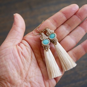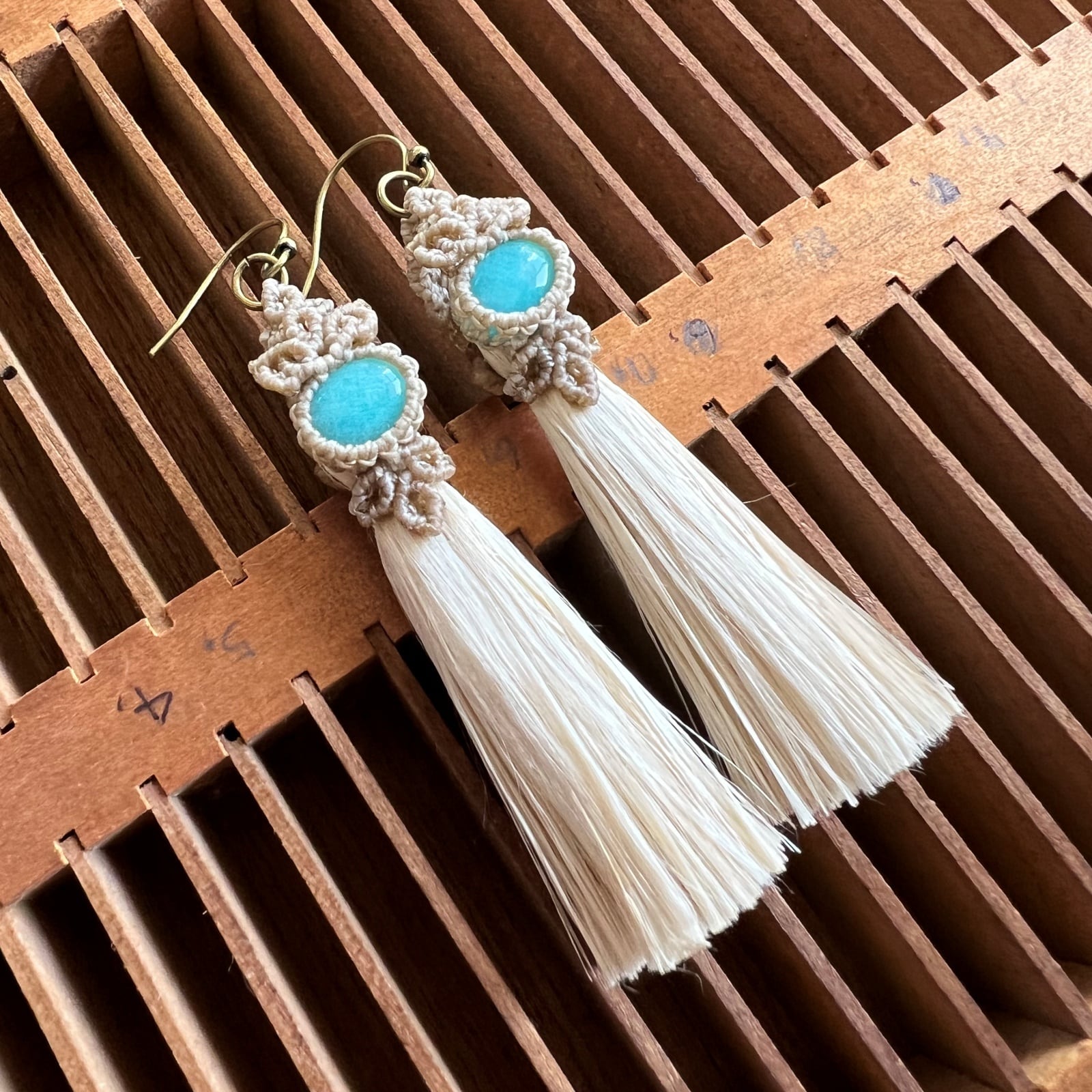 アマゾナイトの鮮やかなブルーと精麻の持つ独特の質感が、耳元を華やかに彩るシンプルながらも個性的なデザインになっています✨