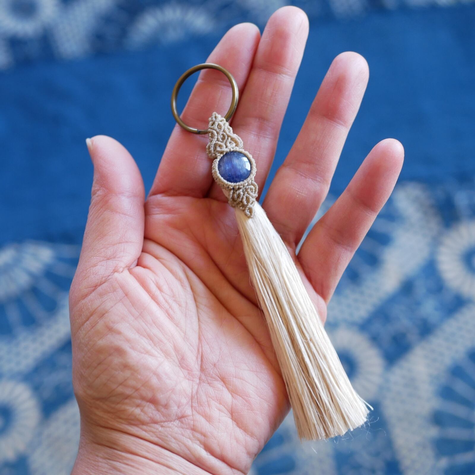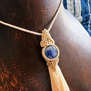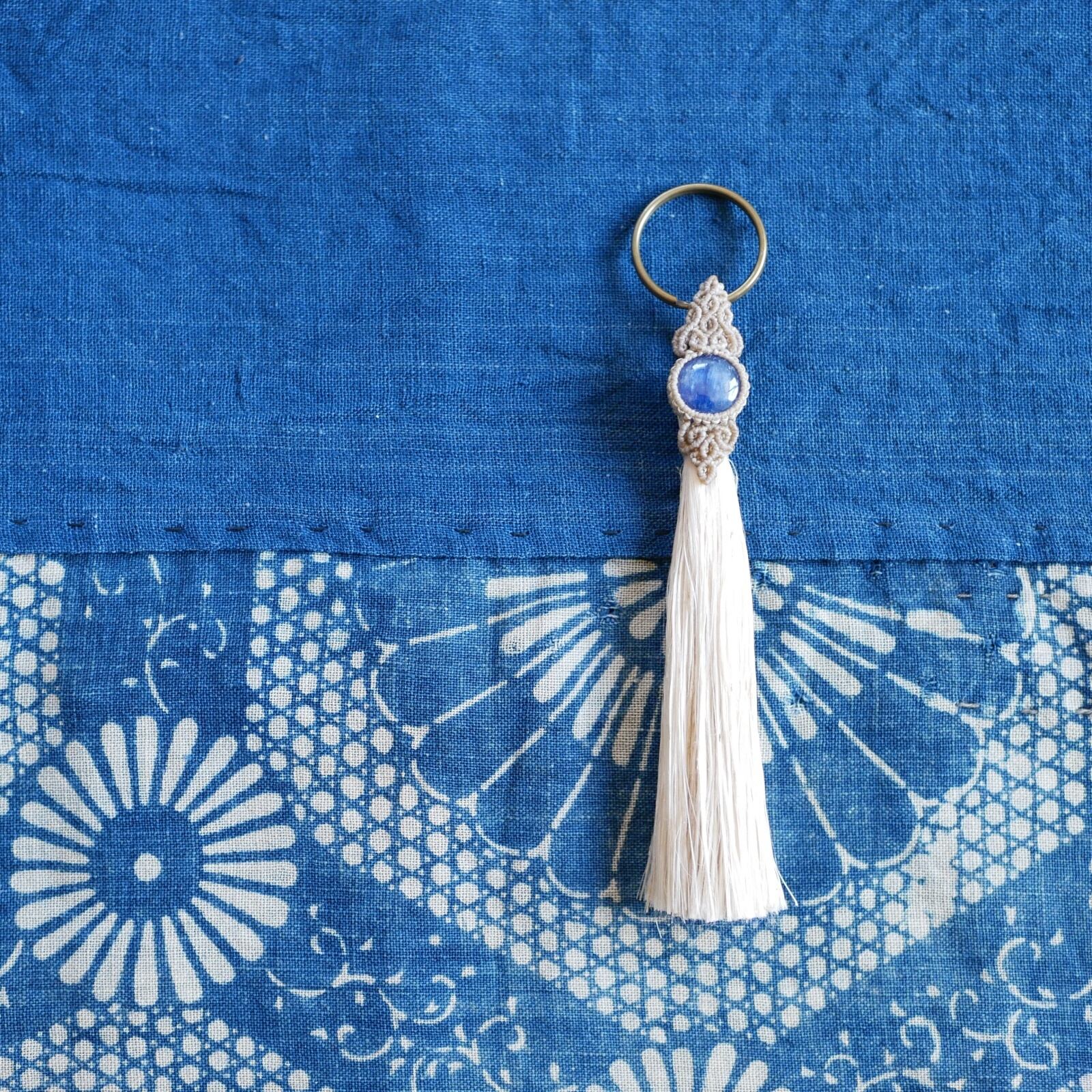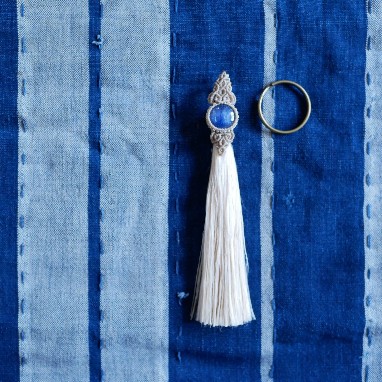 こちらは、日本の古き良き素材、「精麻」と深いブルーが美しい「カヤナイト」を用いた作品です。