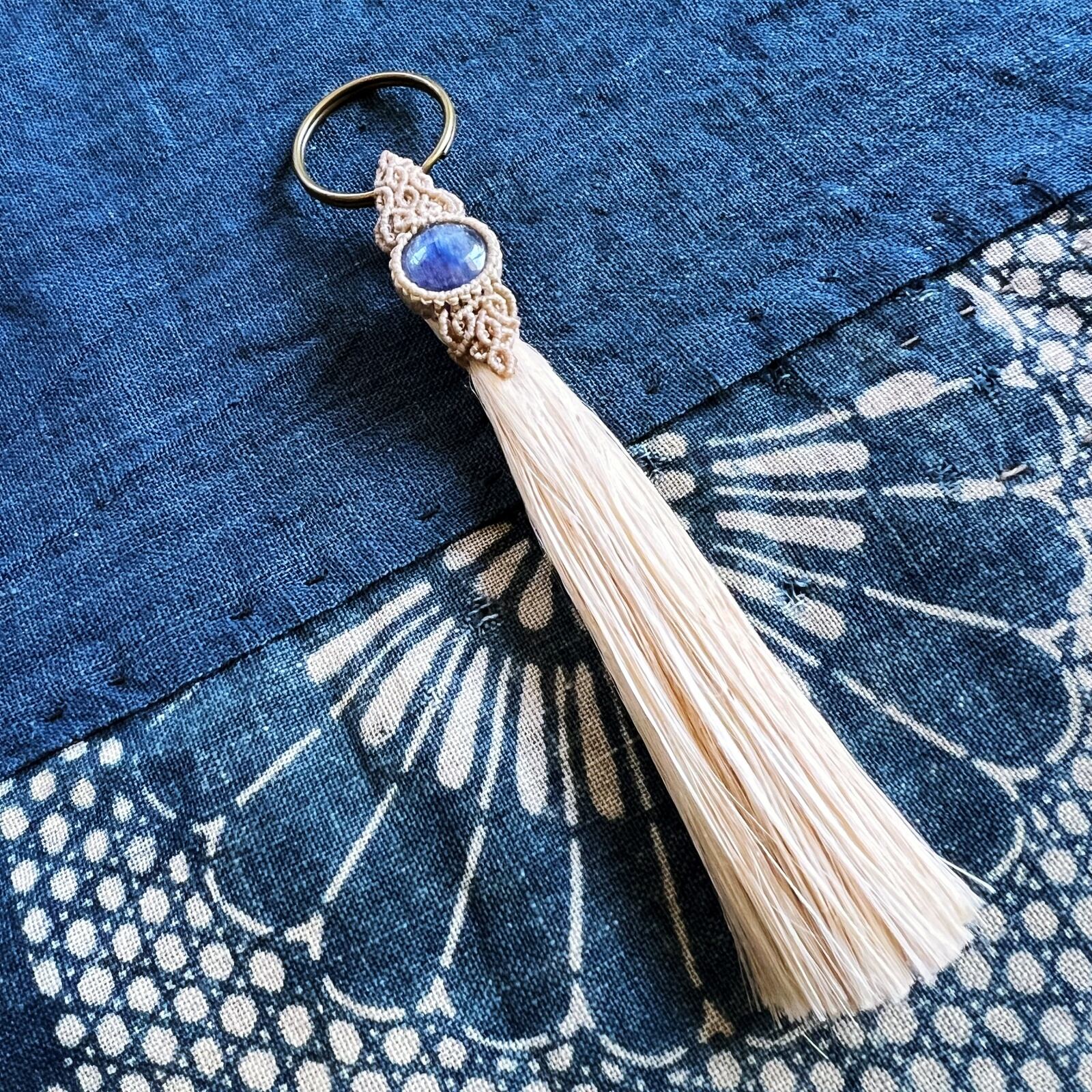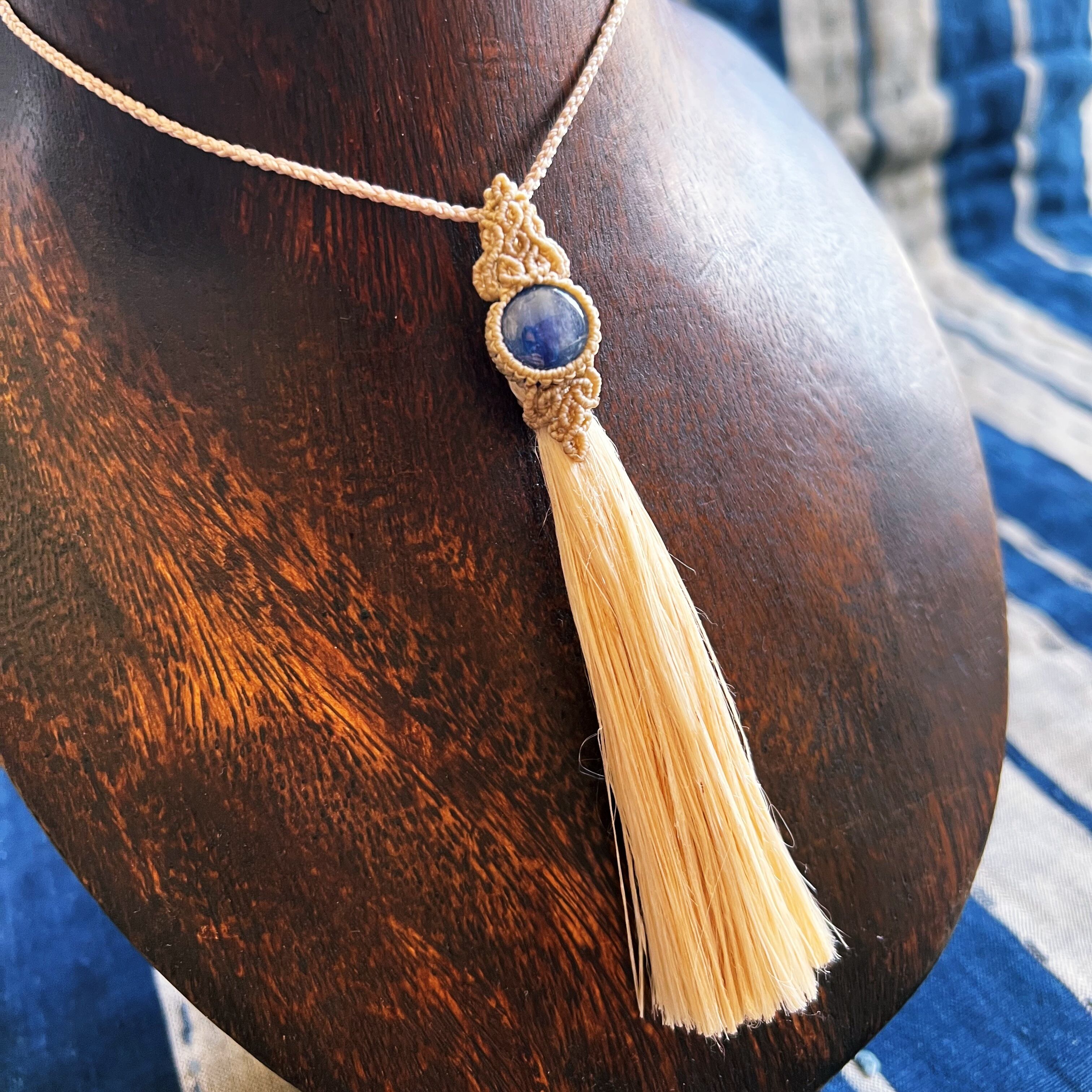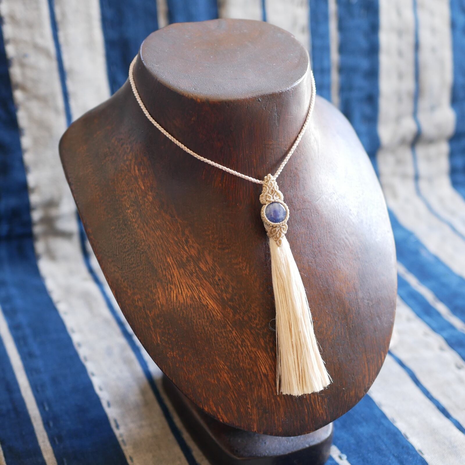こちらは、日本の古き良き素材、「精麻」と深いブルーが美しい「カヤナイト」を用いた作品です。