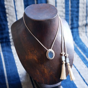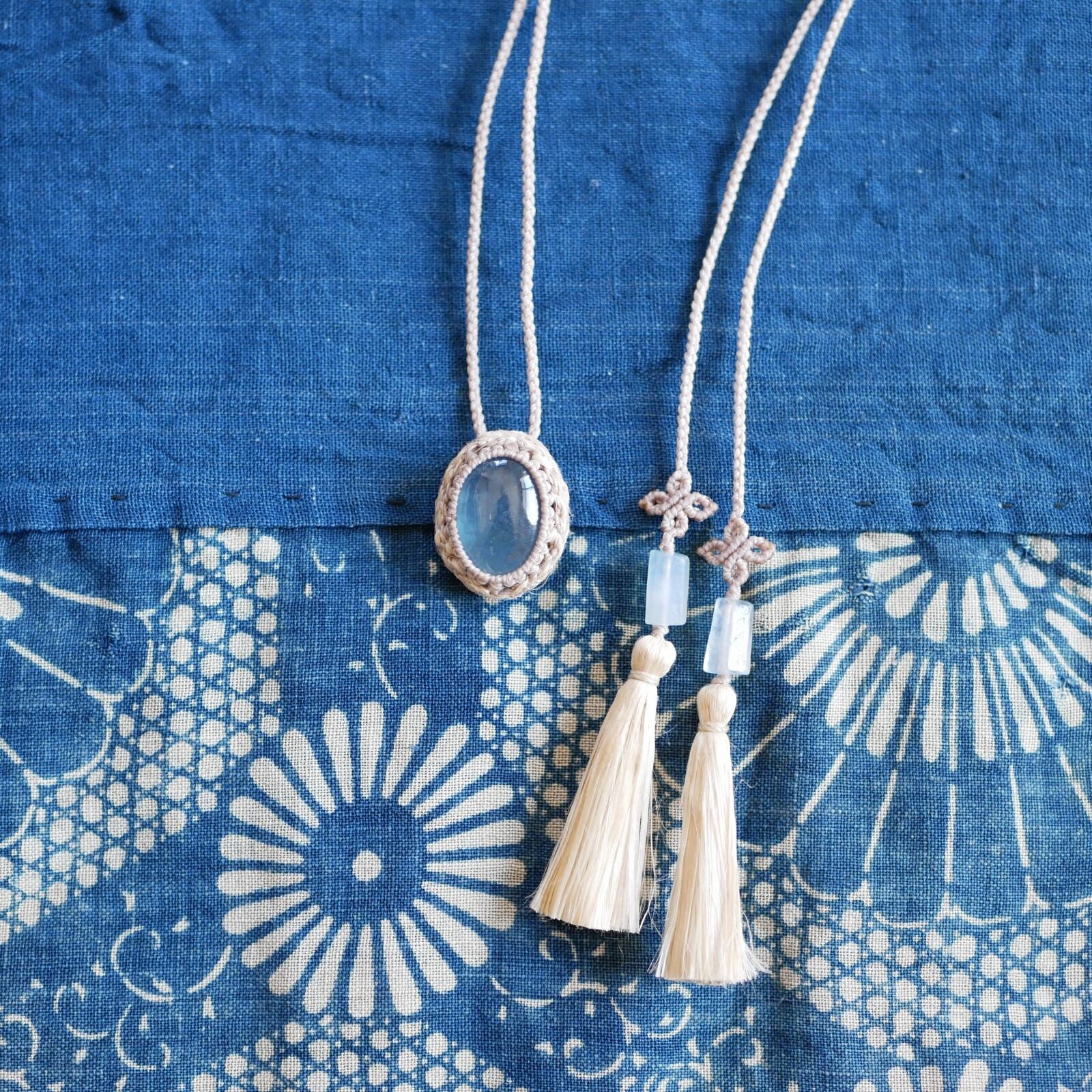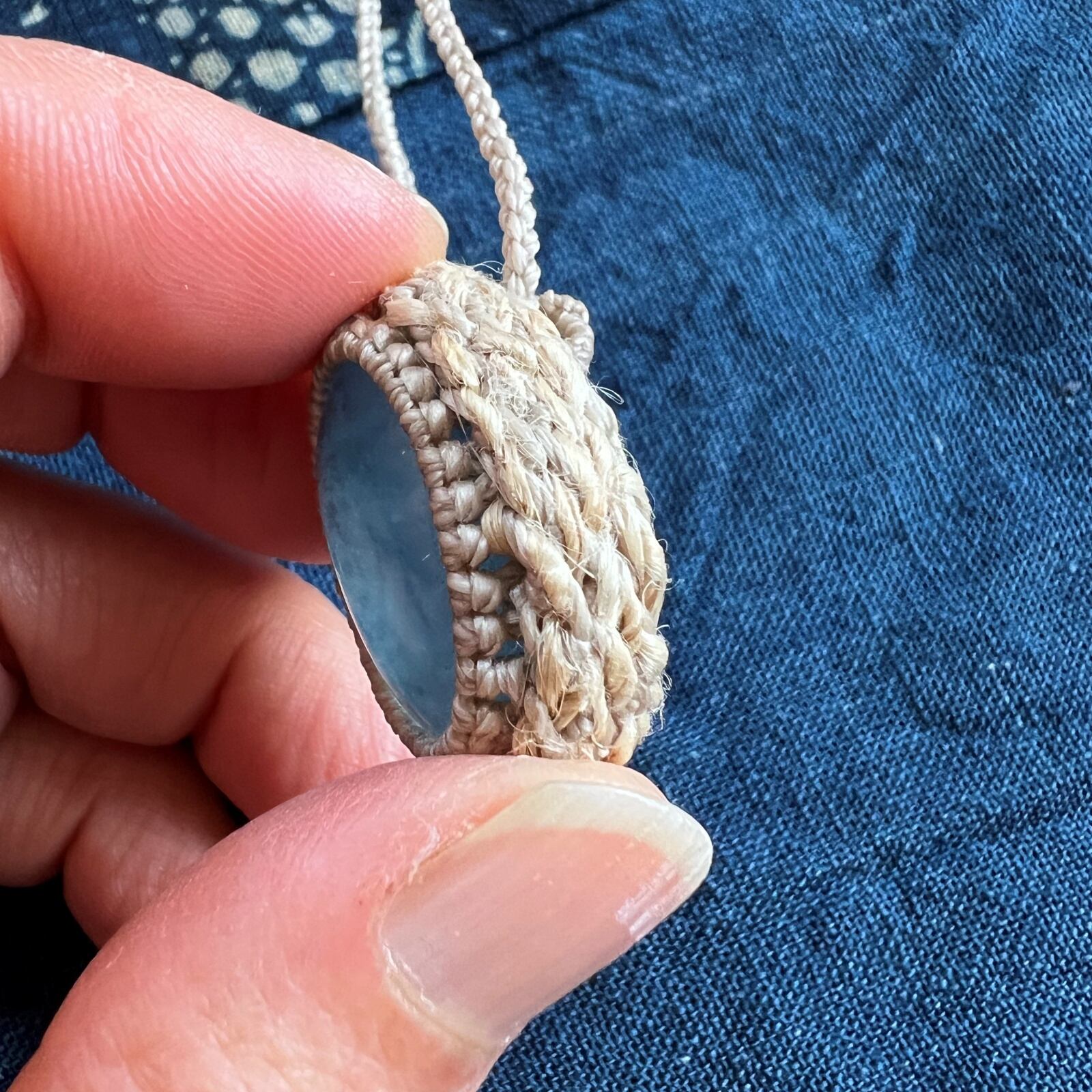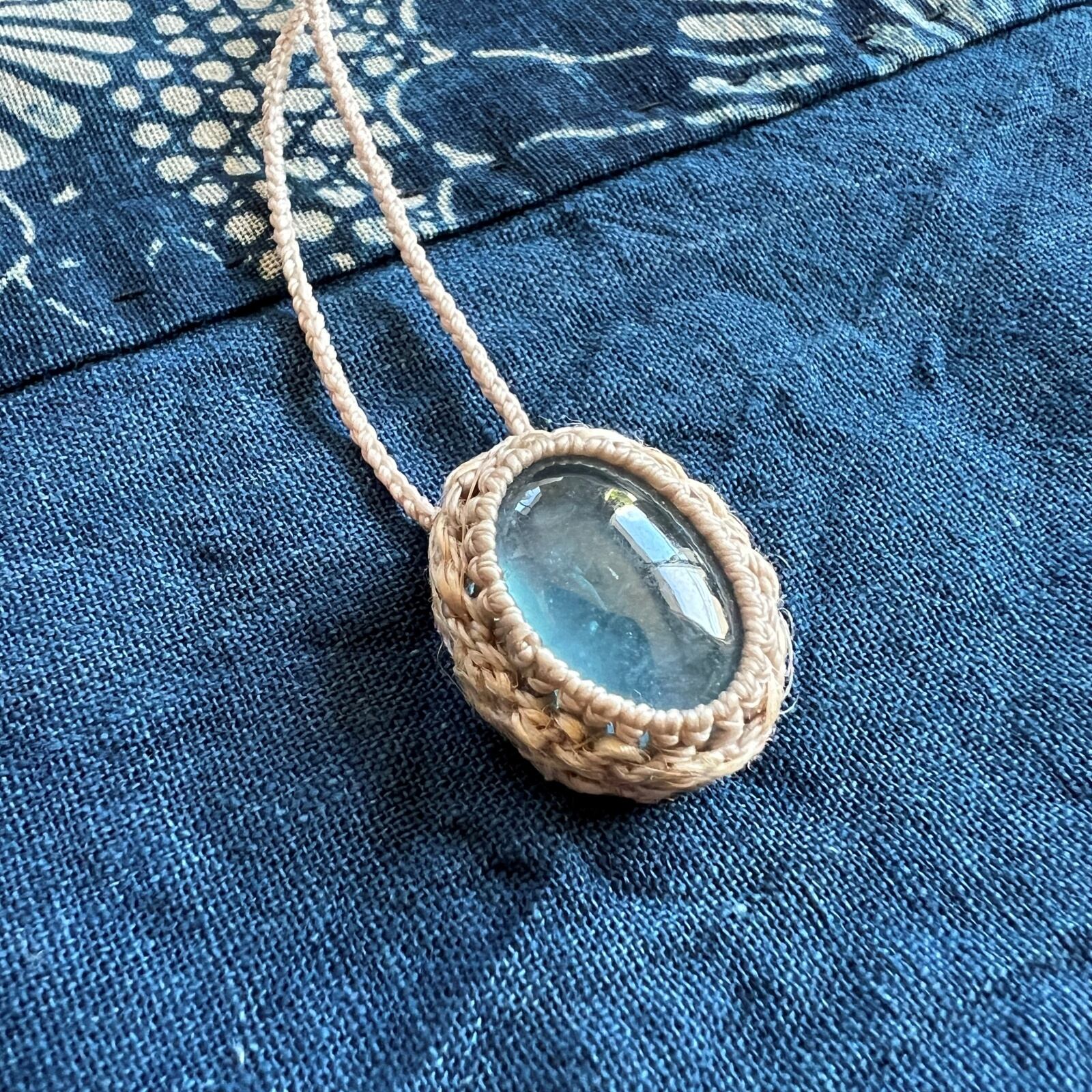 こちらは、瑞々しい透明感のあるデイープブルーアクアマリンの周りに、日本の古き良き素材「精麻」を編み込んだペンダント。
